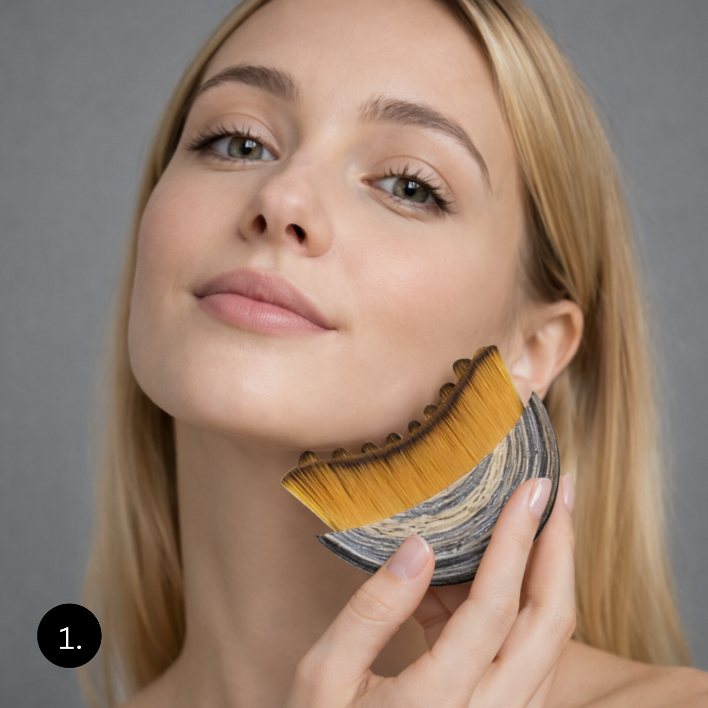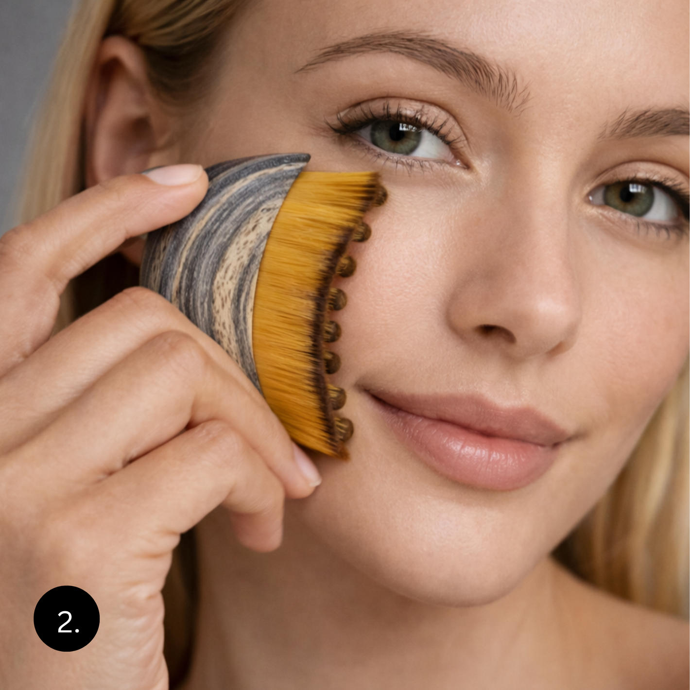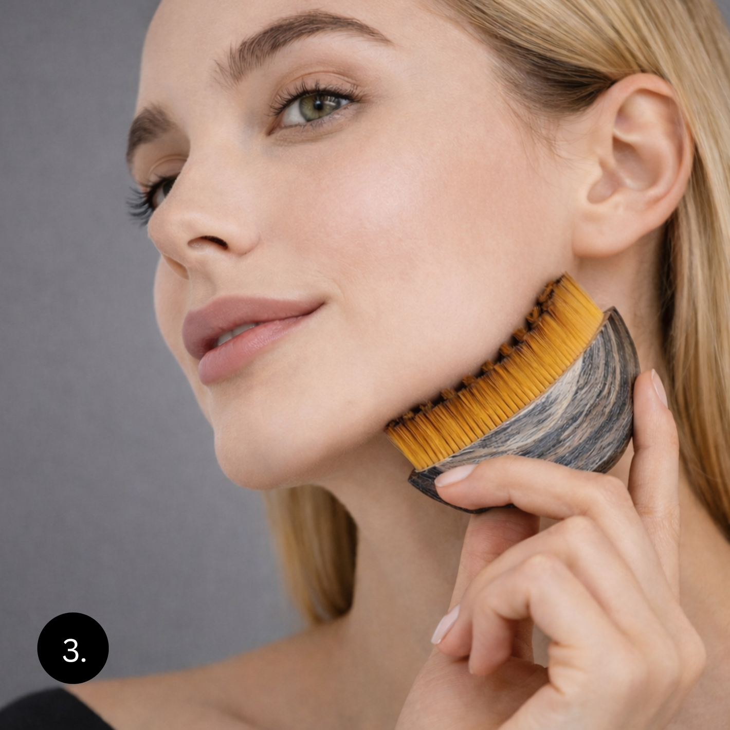Facial puffiness and fluid buildup should be gently drained with SOFT bristles to sculpt and define the jawline.