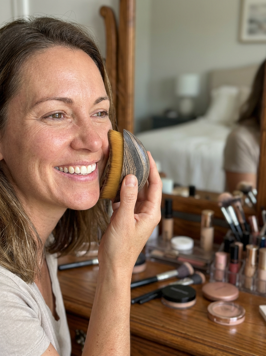 Lightly glide the brush from the corner of the mouth across the cheekbone and towards the ear.